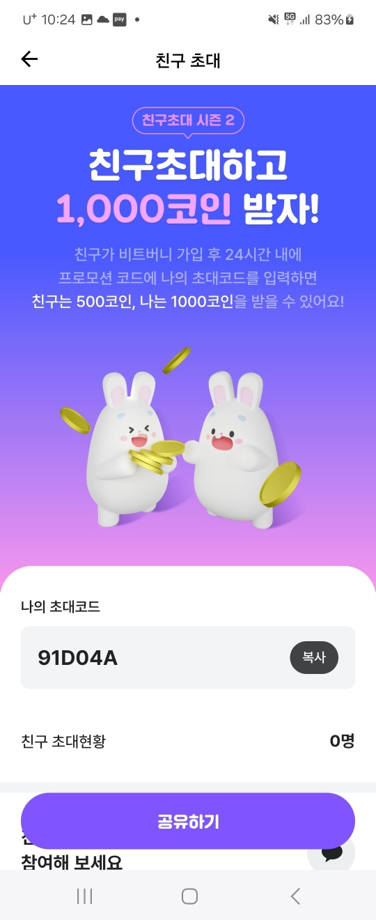 초대한 친구가 초대코드를 입력하면 친구는 500, 본인은 1,000코인을 받을 수 있대요!