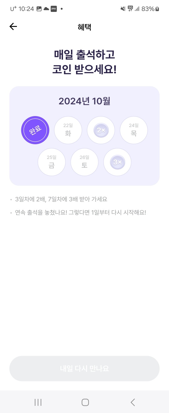 매일 출석하면 코인을 받을 수도 있구요!