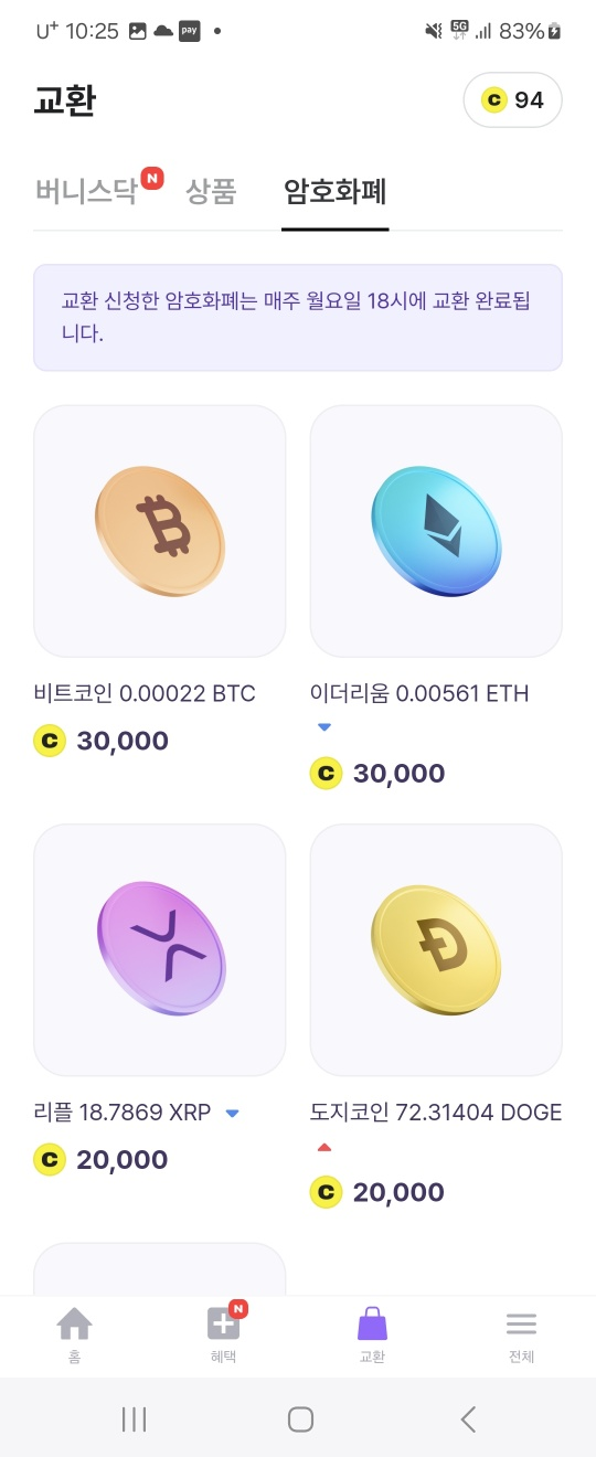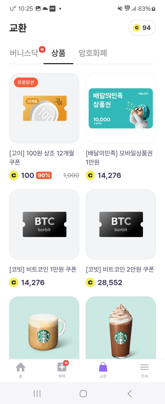 그 밖에 코인으로 배달상품권이나 스타벅스 상품권도 구매가 가능하고, 코인을 구매하고 싶으신분들은 비트코인을 포함한 메이저 알트코인들을 쉽고 빠르게 구매할 수 있어요! 코인에 코를 모르는 사람도 무료로 쌓이는 돈으로 코인을 구매할 수 있으니 안할 이유가 없죠??
