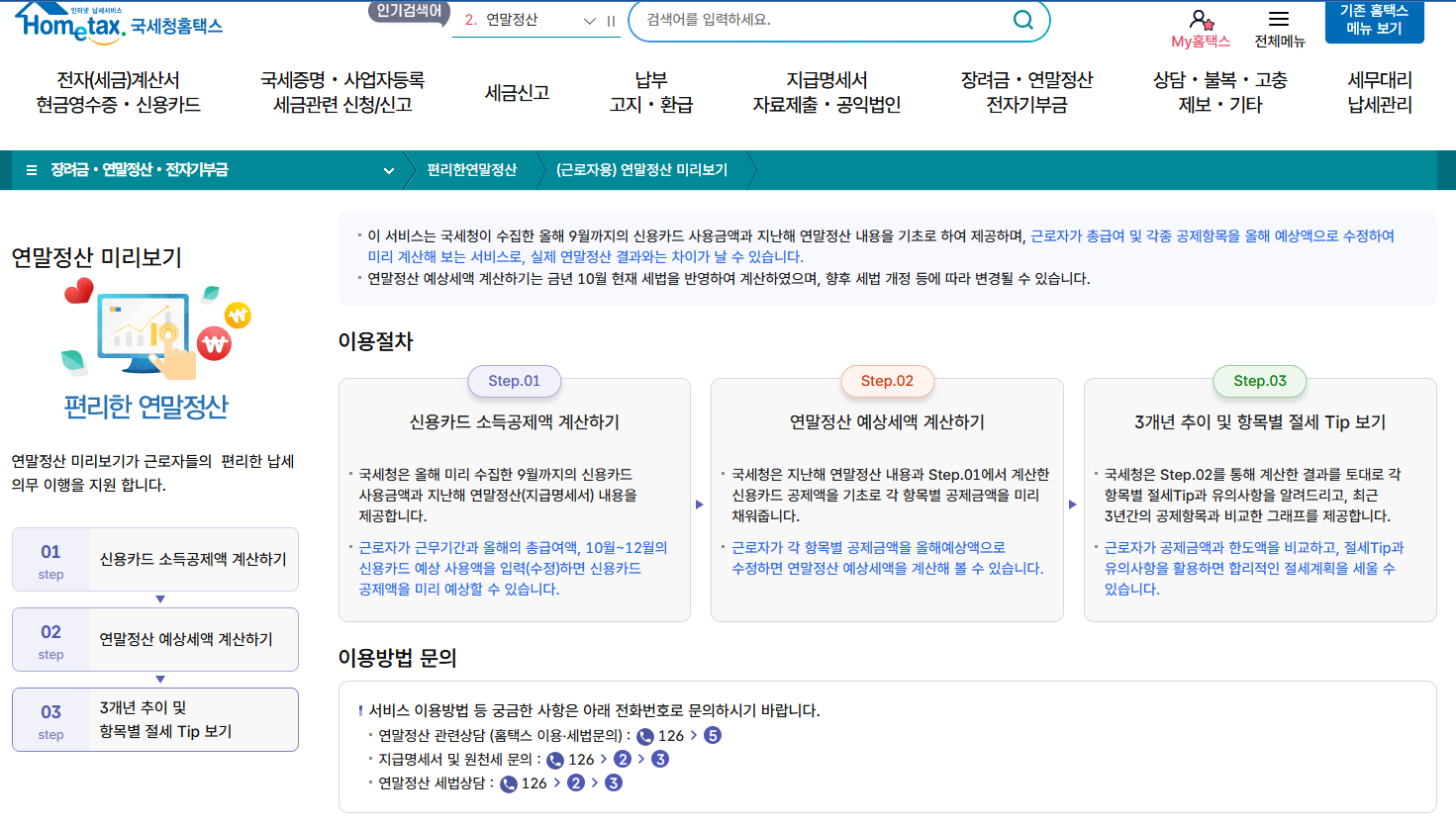 예상 세액계산 | 지난 연말정산 결과와 2024년 1월부터 9월까지의 신용카드 사용액을 기반으로 내년 연말정산 시 예상되는 세액을 계산할 수 있습니다. |
