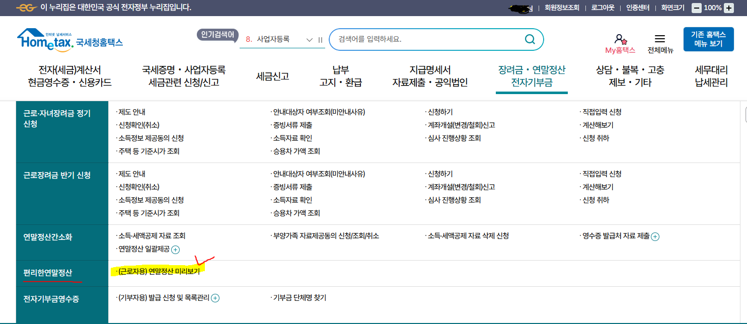 3. 연말정산 미리보기 선택 : 연말정산 '미리보기' 메뉴를 선택합니다.