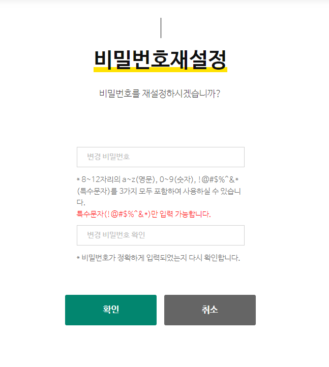 요렇게 비밀번호 재설정 화면이 나오고 변경할 비밀번호를 입력하고 확인을 눌러주세요! (특수문자 포함되어야합니다)