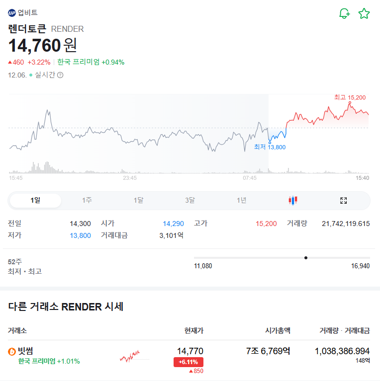 렌더는 현재 2024년 12월 5일 업비트 원화마켓에 상장하여 전일 기점으로 28% 상승률을 보이고 있습니다.